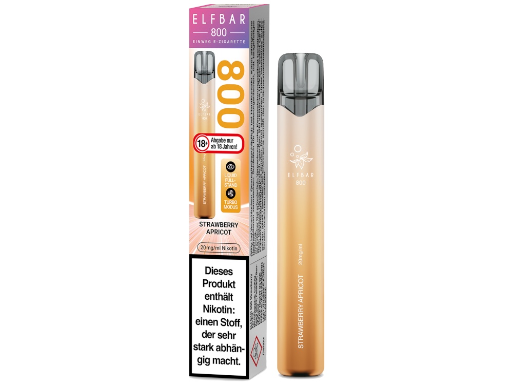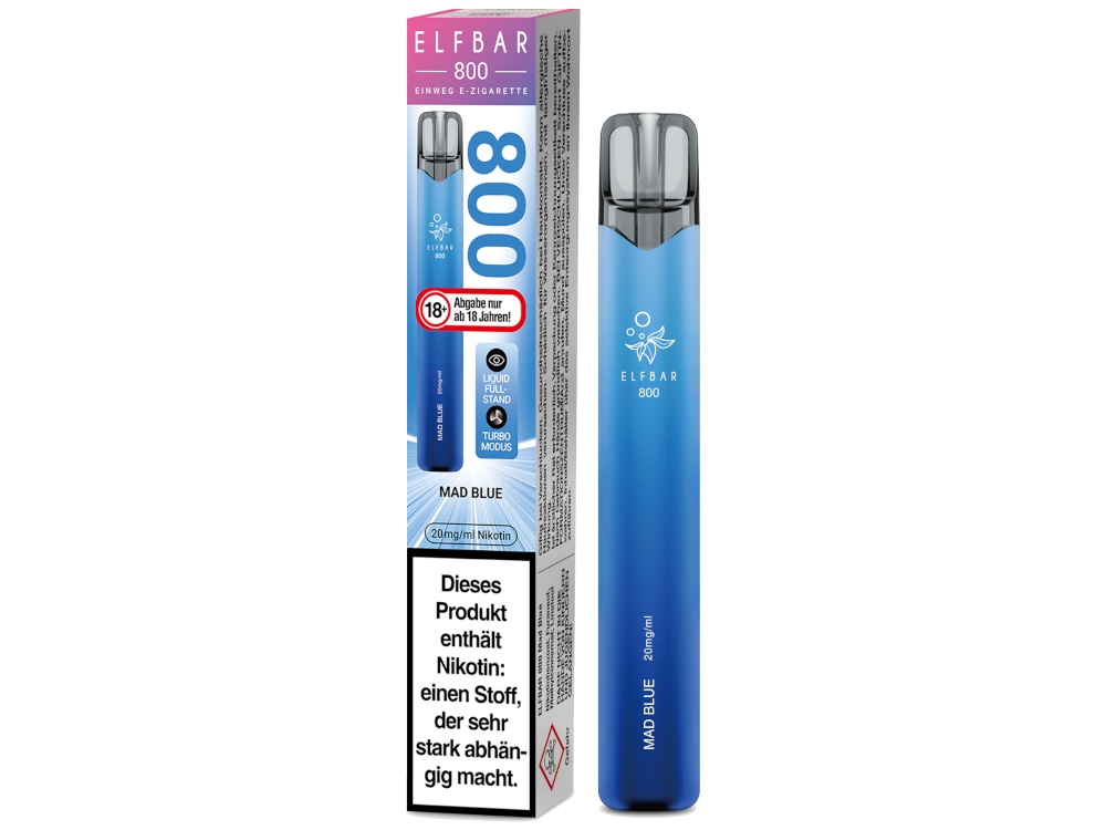 Die Elfbar 800 Einweg-E-Zigarette verfügt über ein Tankvolumen von 2 ml, das mit Nikotinsalz Liquid in einer Nikotinstärke von 20 mg/ml vorbefüllt ist. Alternativ sind einige Sorten auch ohne Nikotin vorhanden. Der fest verbaute Akku der Elfbar 800 hat eine Kapazität von 550 mAh und ermöglicht etwa 800 Züge. Sie können aus 20 verschiedenen Geschmackssorten wählen, die überwiegend fruchtig sind und beim Dampfen einen Hauch von Frische bieten. Das Gerät wird durch eine integrierte Zugautomatik aktiviert. Mit einem Button an der Rückseite können Sie den Turbo-Modus aktivieren, welcher intensiveren Geschmack und dichtere Dampfwolken ermöglicht. Dank der speziellen Bauform des Akkus ist der Füllstand des Tanks jederzeit ablesbar. Weder der Akku noch der Tank der Elfbar 800 können nach dem Verbrauch wieder aufgeladen oder aufgefüllt werden, weshalb das Gerät nach Gebrauch ordnungsgemäß entsorgt werden muss.