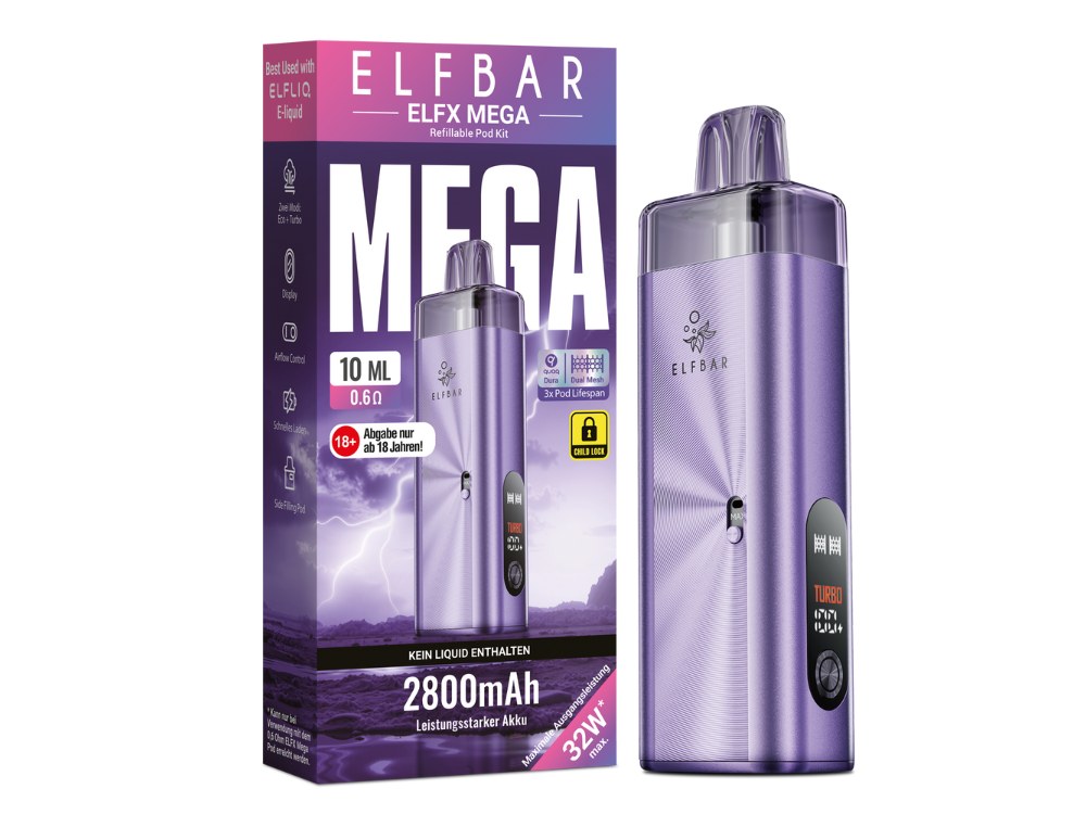 Das Elfbar Elfx Mega E-Zigaretten Set ist ein Mehrweg-Pod-System, das sich durch den integrierten 2.800 mAh Akku mit maximal 32 Watt Ausgangsleistung und der wählbaren Modi Eco/Turbo auszeichnet. Das Gerät ist in verschiedenen Farben erhältlich und für MTL/RDL geeignet. Die Bedienung erfolgt über eine Zugautomatik und eine Funktionstaste, wobei ein Farbdisplay den Ladezustand anzeigt und der Akku schnell über USB-C geladen wird. Im Set enthalten ist der 10 ml fassende ELFX Mega Pod mit einer integrierten Dual Mesh Coil (0,6 Ohm), der über ein Side Filling System befüllt wird; Pods mit 5 ml und einem Widerstand von 0,8 Ohm sind separat erhältlich. Die Airflow Control an der Seite des Akkus dient zur individuellen Anpassung des Zugwiderstands. Zur Inbetriebnahme ist nach dem Entfernen der Schutzfolie und dem Befüllen eine Wartezeit von ca. fünf Minuten einzuhalten. Das Ein-/Ausschalten sowie die Aktivierung/Deaktivierung der Kindersicherung erfolgen durch fünfmaliges Betätigen der Funktionstaste, der Moduswechsel durch einmaliges Drücken. Eine Zugbegrenzung stoppt die Stromabgabe nach acht Sekunden, und die Kindersicherung wird automatisch nach drei Zügen über acht Sekunden innerhalb einer Minute aktiviert.