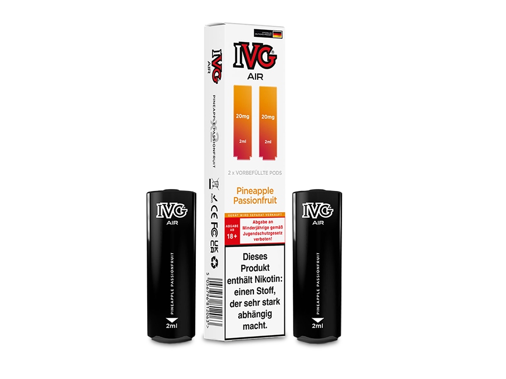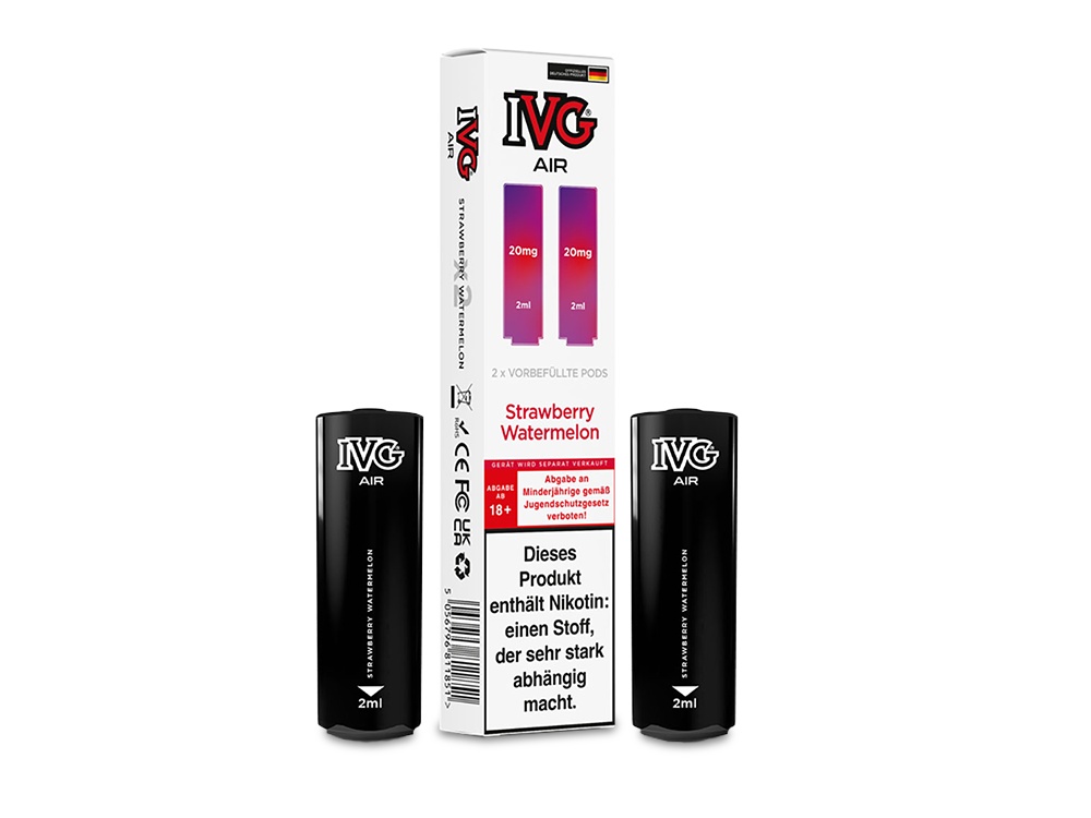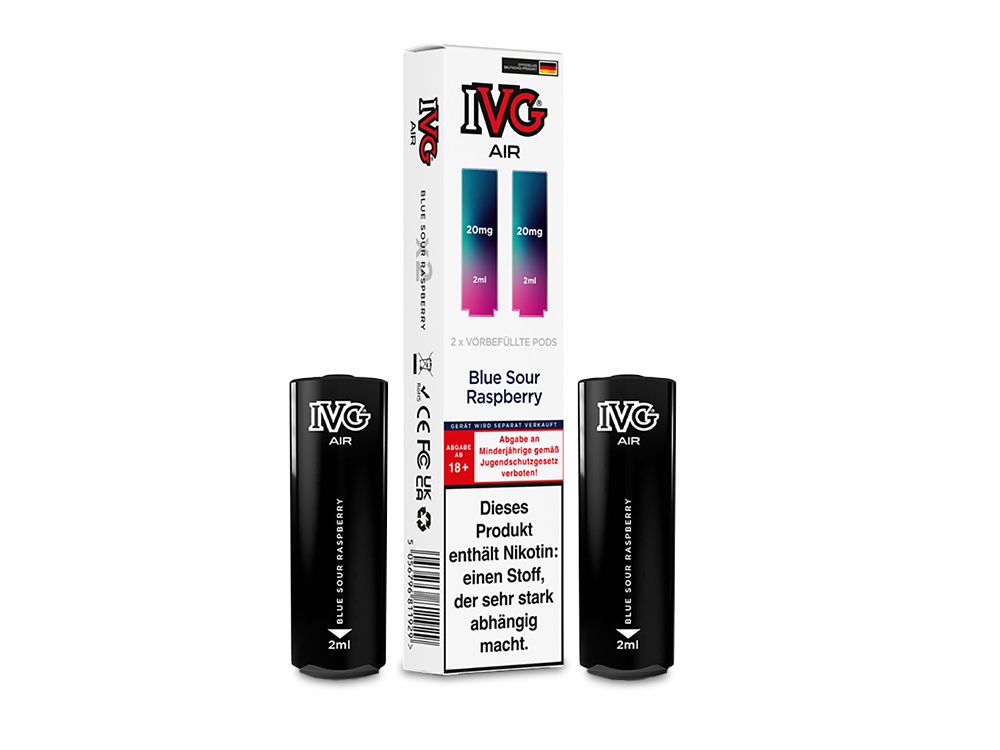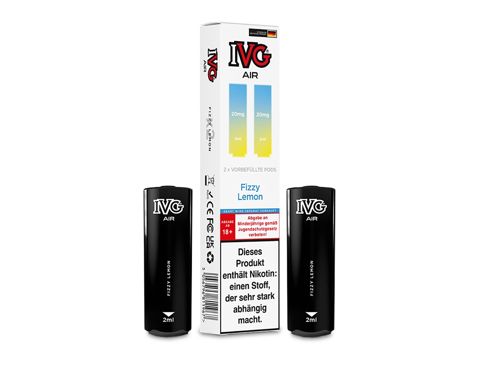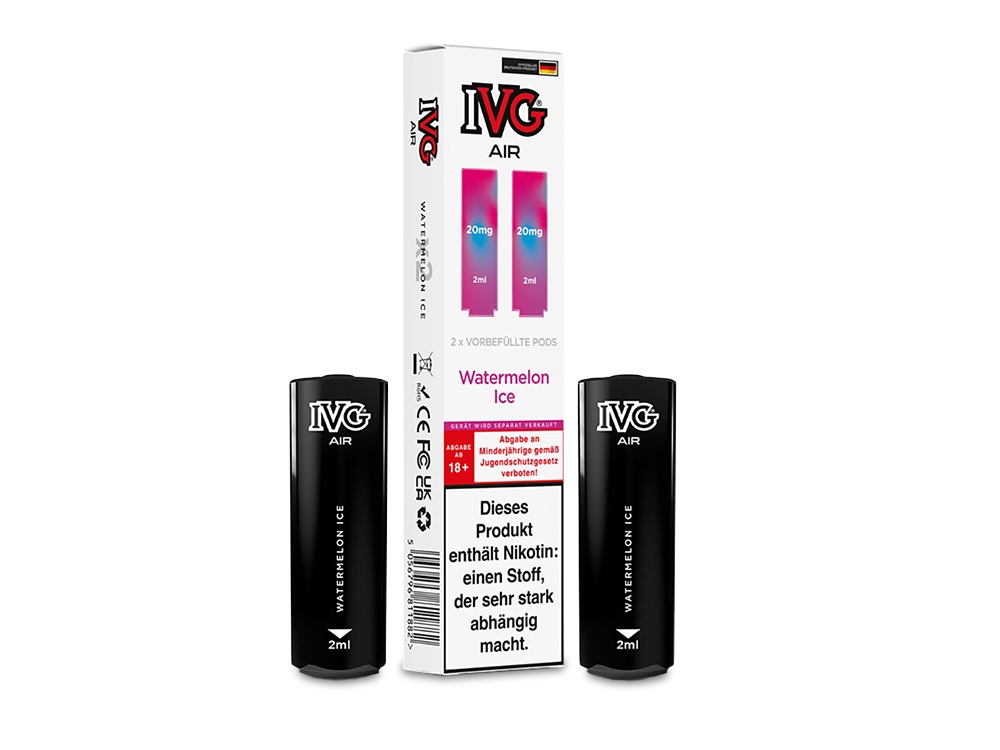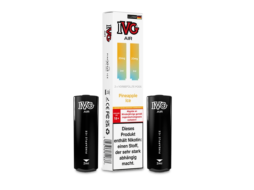 Der IVG AIR Pod ist die ideal passende, vorbefüllte Cartridge für den AIR 2in1 Akku von IVG und wurde speziell für dessen Einsatz konzipiert. Ausgestattet mit einer 1,0 Ohm Mesh Coil bietet der Pod ein herausragendes Dampferlebnis. Mit einem Fassungsvermögen von 2 Millilitern sind die wechselbaren Cartridges mit Nikotinsalz-Liquid in einer Stärke von 20 mg/ml gefüllt. Sie haben die Auswahl aus 15 verschiedenen Geschmacksrichtungen, die sich überwiegend auf fruchtige und fruchtig-kühle Aromen konzentrieren. Der IVG AIR 2in1 Akku ermöglicht die gleichzeitige Nutzung von zwei AIR Pods, sodass Sie mühelos zwischen den unterschiedlichen Geschmäckern wechseln können, indem Sie das Mundstück einfach drehen. Bitte beachten Sie, dass die IVG AIR Pods nicht wiederbefüllbar sind. Sobald der Liquidvorrat erschöpft ist, müssen die Pods ersetzt werden. Bei jeder Bestellung erhalten Sie zwei Cartridges in der von Ihnen gewünschten Geschmacksrichtung.Auszeichnung gemäß CLP-Verordnung (EG) Nr. 1272/2008