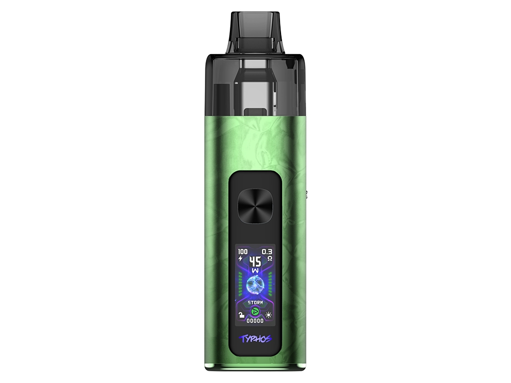 Das Uwell Typhos E-Zigaretten Set ist ein Pod-System, das den Typhos Akku mit einer Kapazität von 2.000 mAh und einer maximalen Ausgangsleistung von 45 Watt umfasst. Die Steuerung und Anzeige von Betriebsmodi wie "Storm" und "Waves" erfolgt über ein 1,05-Zoll HD-Farbdisplay. Im Lieferumfang sind zwei verschiedene Typhos Pods enthalten: ein vorinstallierter 0,3 Ohm Pod für direktes Lungendampfen (DTL) und ein 0,6 Ohm Pod für MTL/RDL, die beide ein großes Tankvolumen von 6,0 ml aufweisen und per Side-Filling-System befüllt werden. Das Gerät verfügt über eine regulierbare Airflow Control zur Anpassung des Zugwiderstands. Da die Verdampferköpfe in den Pods fest verbaut sind, werden diese als komplette Einheit ausgetauscht; passende Ersatz-Pods sind separat in Zweierpackungen erhältlich. Die Aufladung des Akkus erfolgt via USB-C mit einem Ladestrom von DC 5V/2A.
